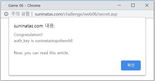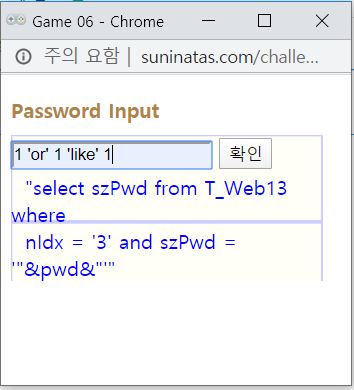 그래서 연산자(=)를 바꿔보았습니다. '='과 비슷한 기능을 할 수 있는 'like'로 바꿔서 SQL문을 넣어보니 쿼리문이 성공을 했습니다. 그래서 팝업창에 'suninatastopofworld!' 라는 단어와 함께 글을 읽을 수 있었습니다.