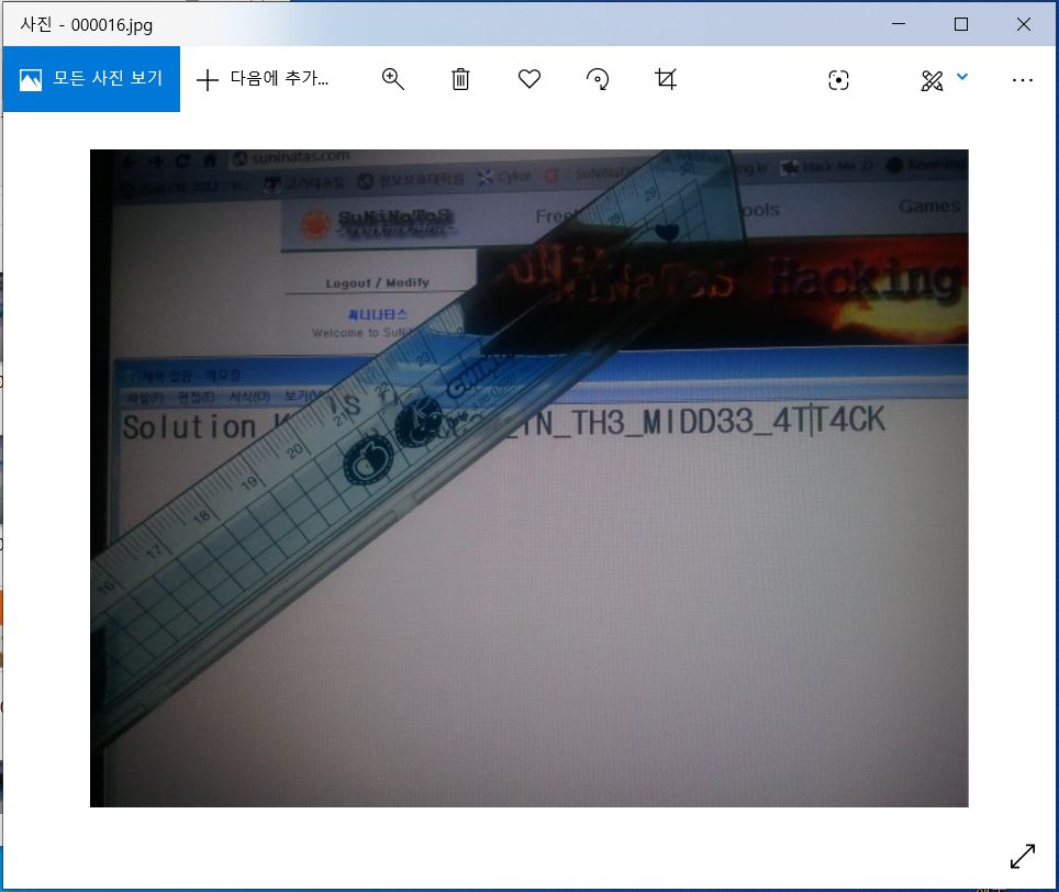 아래의 화면은 21번 문제이다. "What is a Solution key? Is it a Puzzle"이라고 한다. 사진을 보면 키 값이 자 때문에 보인다. 저 자를 치우면 쉽게 키값을 얻어 낼 수 있을 것이다.