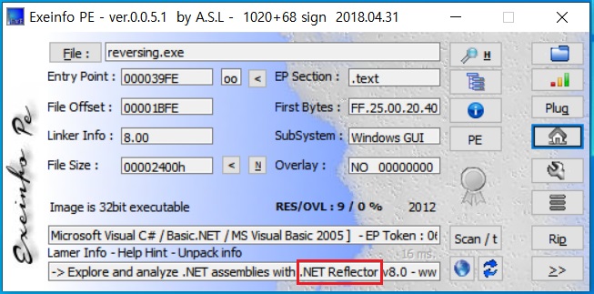 그래도 일단 파일이 정확하게 무엇인지 판단하기 위해 'Exenfo PE'로 확인해보았다. 확인해보니. NET Reflector를 이용해서 문제를 풀면 되는 것 같다.