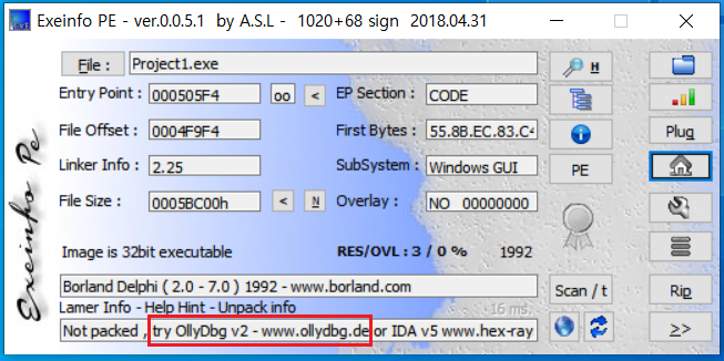 그래서 나는 'Exeinfo PE' 툴을 이용해서 해당 실행파일이 무엇인가 확인해봤다. 확인해보면 해당 파일은 'OllyDbg'를 이용하면 된다고 한다.