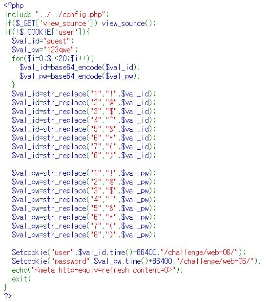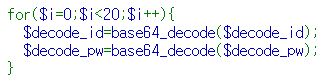아래의 화면에서 for문을 보게 되면 id와 pw를 20번씩 base64_decode을 하는 것을 알 수 있다.
