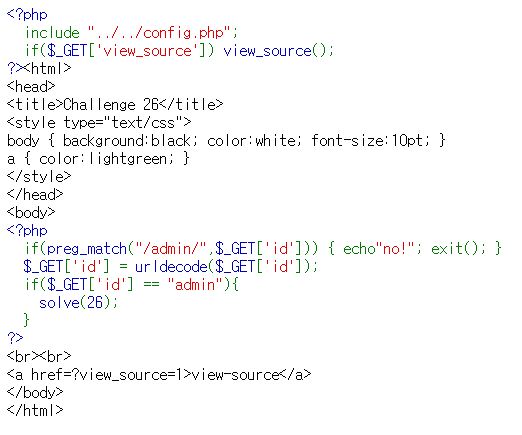 그러면 26번 문제를 풀려면 'view-source'를 확인해봐야 할 것이다. 바로 소스코드를 확인해봤다. 아래의 화면은 문제의 소스코드이다.