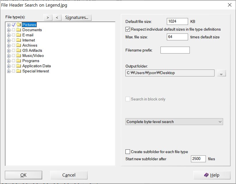 'File Recovery by Type'에 들어가면 아래와 같은 창이 뜨는데, 'Pictures'에 체크하고 'Output folder'를 설정한 뒤 'OK' 버튼을 누르면 된다.